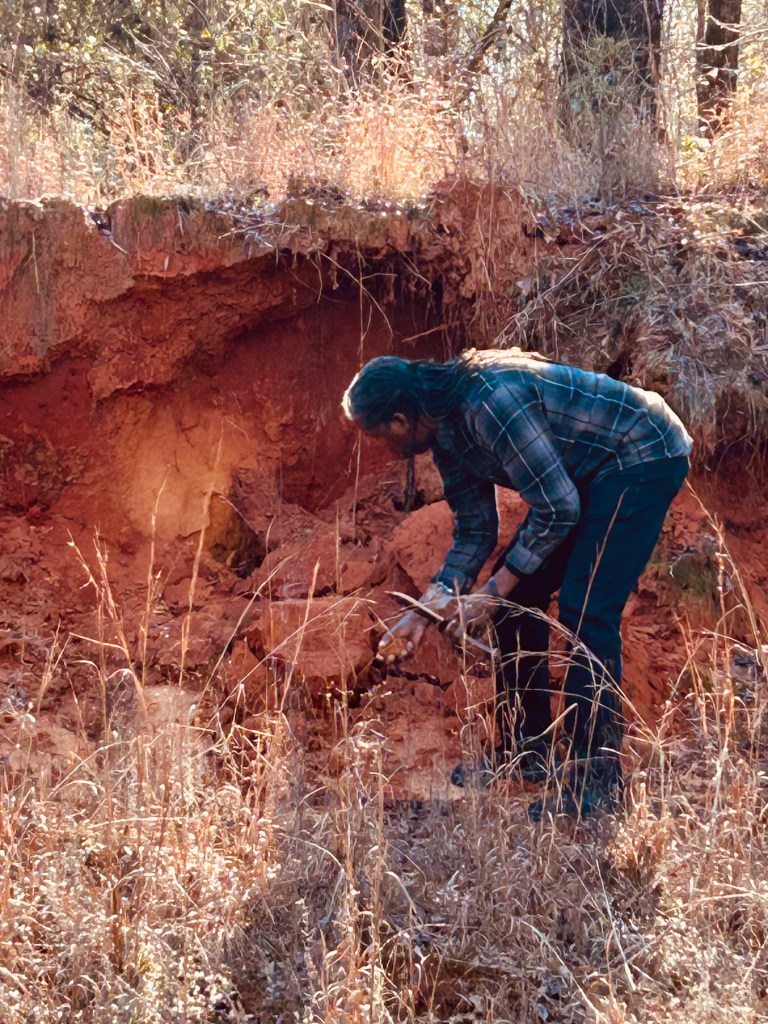 And as I walked back to the car with that red clay and river water tucked inside, I am renewed in a baptismal kind of way.What I do with this red clay isn’t just painting; it’s invocation. It’s listening to what the land remembers and allowing that memory to move through my hands. It’s transforming earth back into story. The pigment becomes portal. It’s granting me access to a lineage older than any of us, and honoring the unseen forces that rise when the material world is treated with respect. This work is my way of staying in conversation with the ancestors and the landscape that shaped them. It’s also my way of reaching down through time to those who will come after. It’s my form of alchemy, turning raw soil into embodiment and testimony. It’s animism in the truest sense, recognizing that the blood, sweat, and tear-rich clay is alive, aware, carrying intention of its own. I don’t force it; I flow with it. The art pieces that come from Holy Ground will carry much more than color. They’ll carry pulse and presence. They’ll carry the truth that the earth is not just beneath us, but with us. I am honored to be its translator.